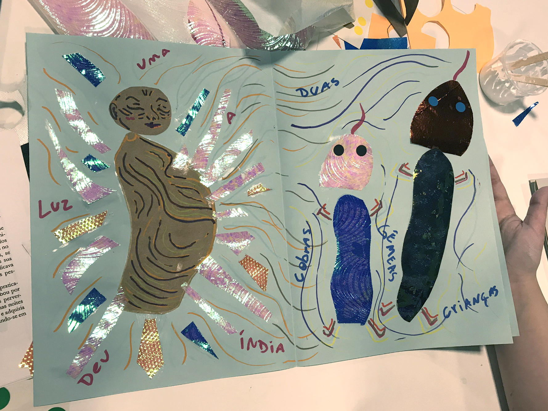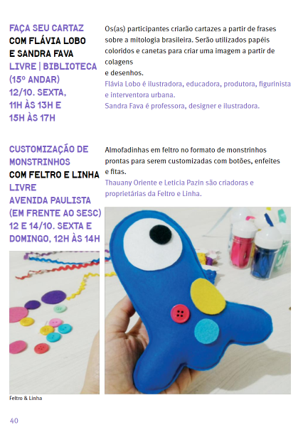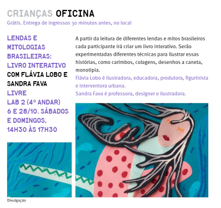 Oficinas que propõem pensar as lendas da cultura brasileira e criar desenhos e colagens.